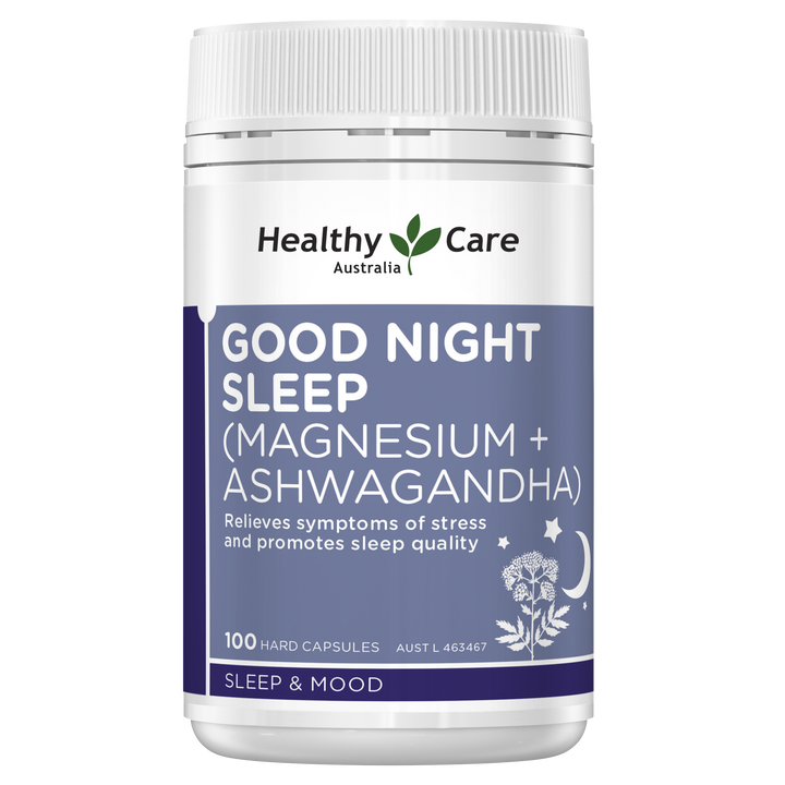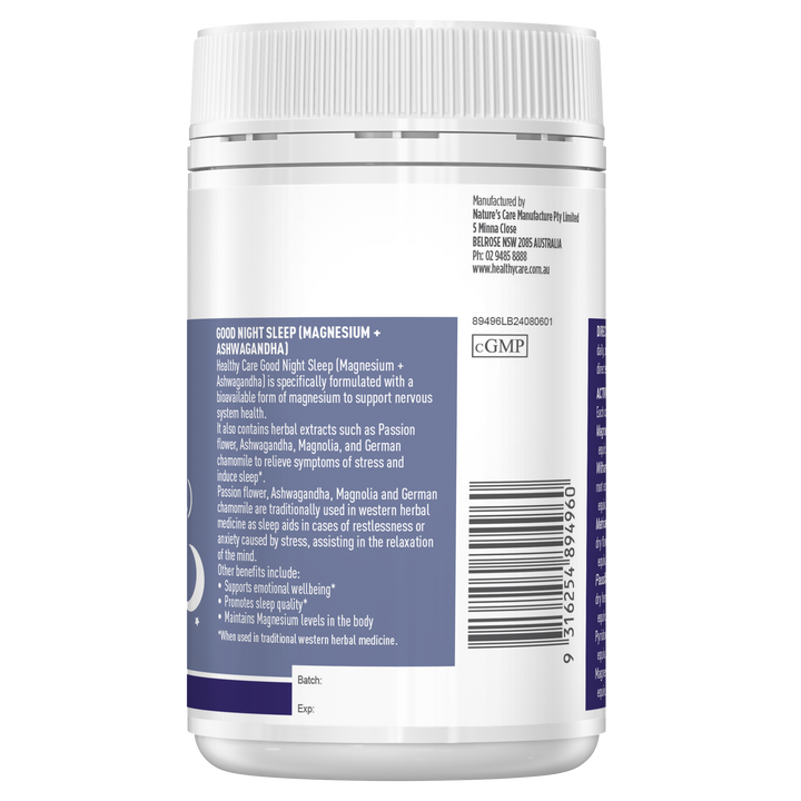 Healthy Care Good Night Sleep is a premium formula combining bioavailable Magnesium with traditional herbal extracts including Passionflower, Ashwagandha, Magnolia, and German Chamomile.