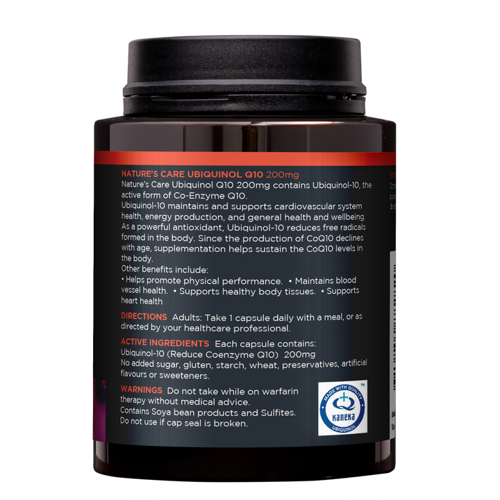 Nature's Care Pro Ubiquinol Q10 Soft Capsules provide a high-strength formula with 200mg of Ubiquinol-10, the active and reduced form of Co-Enzyme Q10. Ubiquinol is vital for heart health, energy production, and overall wellbeing.