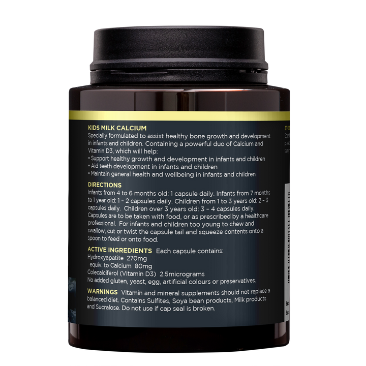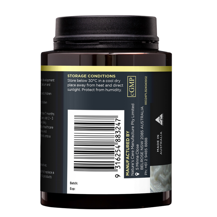 Nature’s Care 兒童牛奶鈣專為支持嬰幼兒健康骨骼生長與發育而配製。該配方結合了鈣與維生素 D3,有助於身體吸收和利用鈣,支持強健的骨骼和牙齒,作為均衡飲食的一部分。